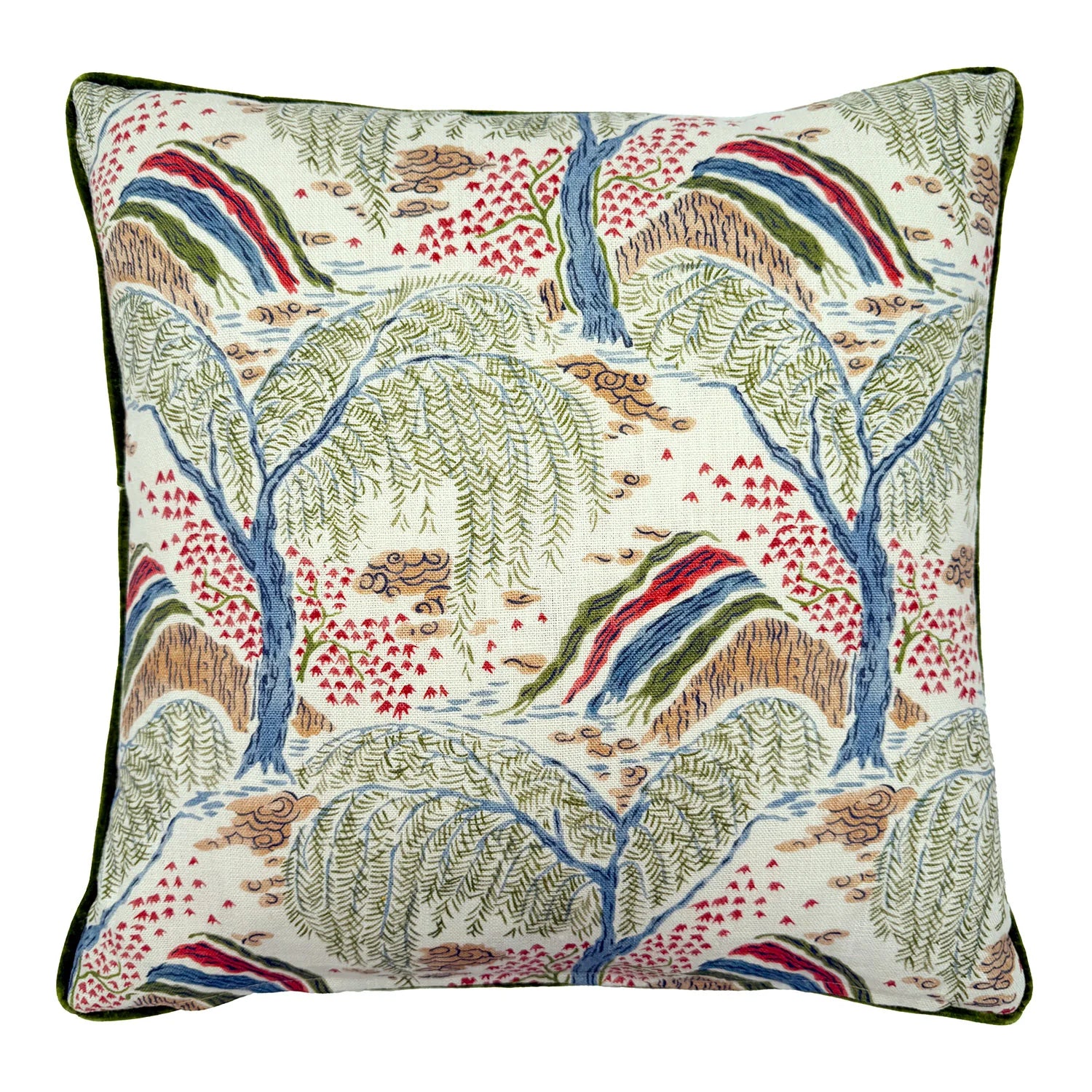 With its scenic design and delicate painterly detail, the Gwendolyn Cranberry Cushion captures the enduring charm of the Orient. Printed on both sides, it features finely drawn willow trees, stylised clouds, and softly layered hills in cranberry, blue, and green tones. Made from 100% linen with smart piping and a hidden zip, it brings character and elegance to any space.