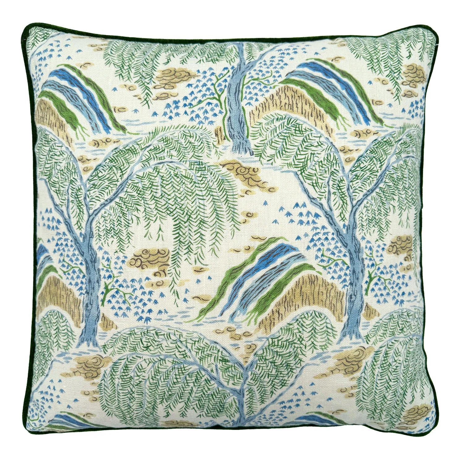 With its painterly landscape and serene palette, the Gwendolyn Emerald Cushion brings a timeless influence to interiors. Printed on both sides on pure linen, this scenic design features sweeping willow trees, stylised clouds, and layered hills in emerald green, soft blue, and neutral tones. Finished with smart piping and a hidden zip, it's a beautifully crafted piece that adds depth and artistry to any room.
