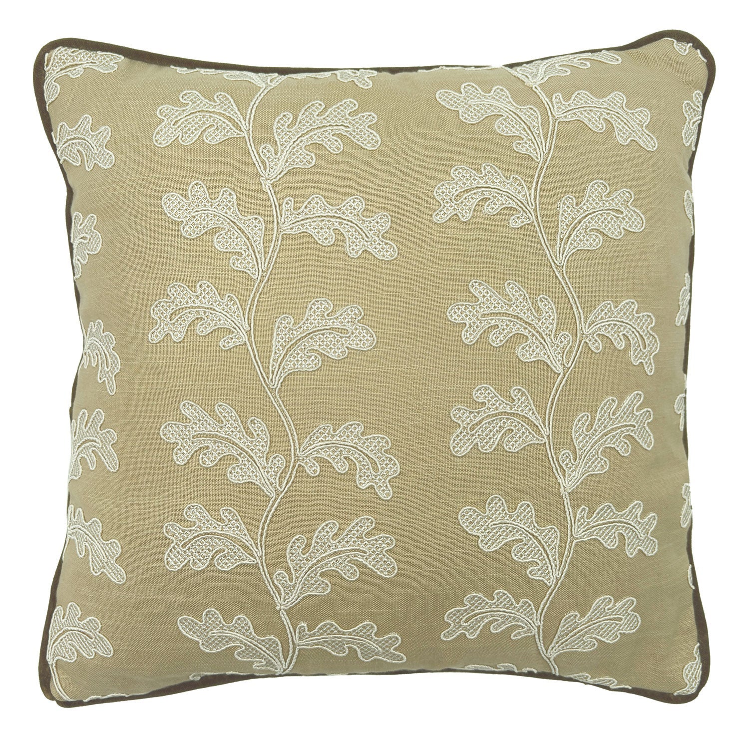 The Helena Sand Embroidered Cushion from Linwood's Titania collection features a striking oak leaf trail, expertly stitched using the traditional couching technique. Flowing leaves unfurl across a soft neutral cotton-linen ground, their sweeping lines brought to life in pure white thread. Finished on both sides with this exquisite embroidery and framed with a luxurious velvet trim, this designer cushion brings understated elegance and craftsmanship to contemporary and classic interiors alike.