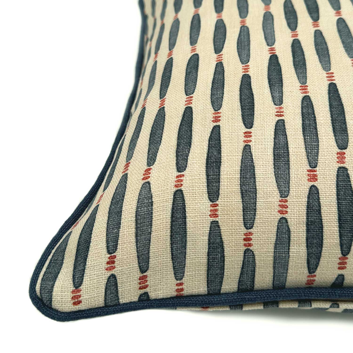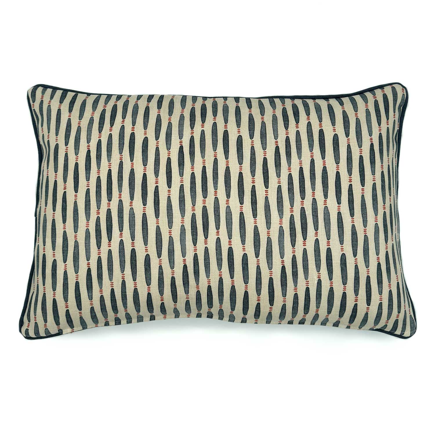 This gorgeous small-scale pattern looks fantastic on this 100% linen cushion. The design, based on a Japanese print, we repainted. Smart velvet piping completes the look.
