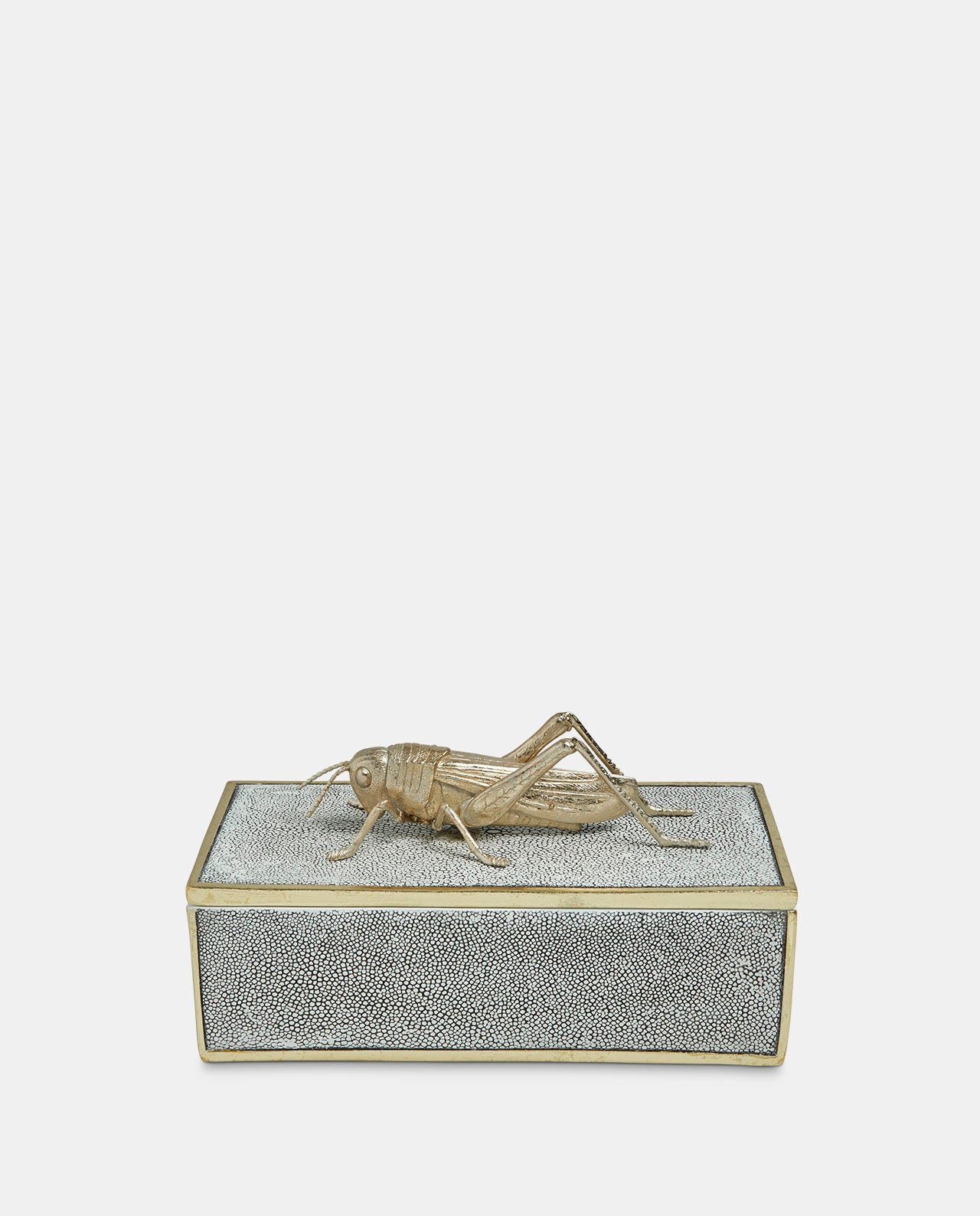 A stunning and beautiful hand made decorative box. Gorgeuous faux shagreen exterior and topped with a stunning gold grasshopper. The perfect box to keep all your small precious items in.