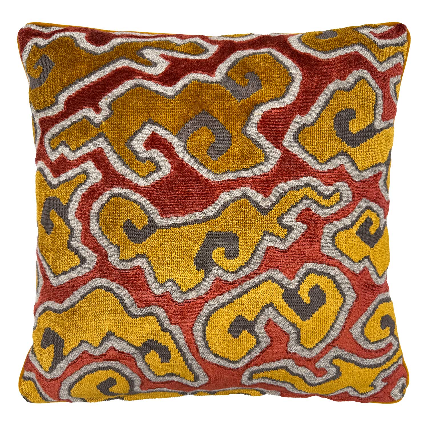 Stylised clouds with a Japanese influence swirl across the Kumo Flame Velvet Cushion, bringing bold movement and colour to any space. Woven in vibrant jacquard velvet and featuring the striking design on both the front and back, this cushion adds energy, depth, and texture – perfect for elevating sofas, beds, or reading corners